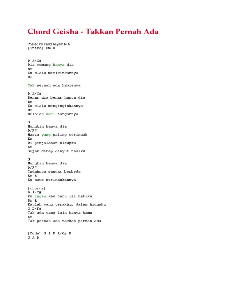 Chord Tak Kan Pernah Terindah - G mungkin hanya dia d/f# harta yang paling terindah em di perjalanan hidupku em sejak derap denyut nadiku.