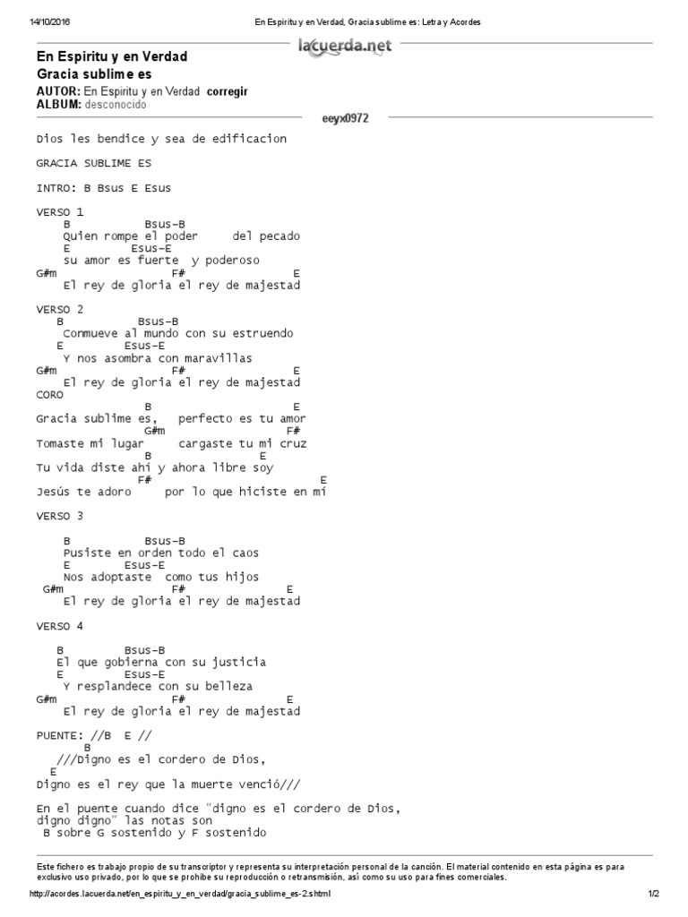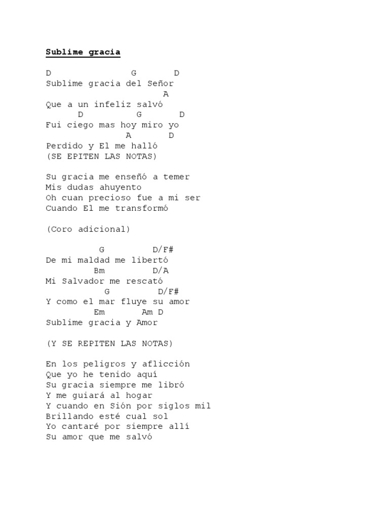 Gracia Sublime Acordes : D d/f# g d fui ciego mas hoy miro yo, d a d perdido y l me hall.